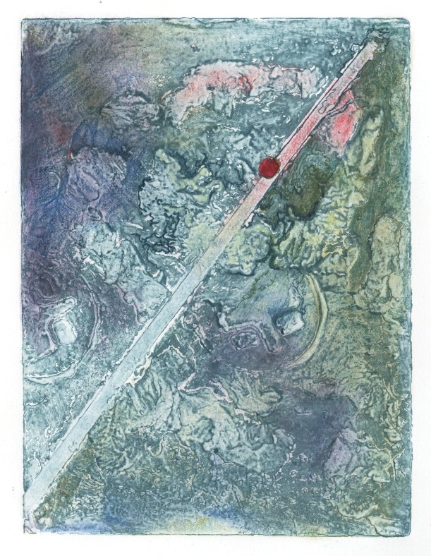 I have been losing my frustration (about not getting into juried shows) by work: always the best solution. So here are updates, maybe completions, of several items in work: first is an aquarelle graphite “Excavation”, the second an older pencil drawing on vellum. The three colored pieces are recent collagraph prints that were dull monotone until the addition of pan pastel,colored pencil, & pen.