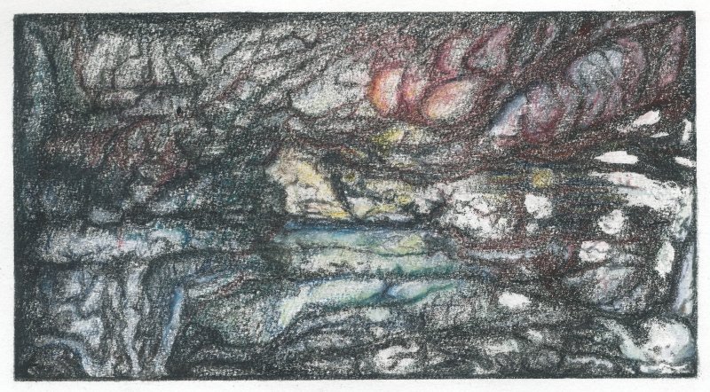I have been losing my frustration (about not getting into juried shows) by work: always the best solution. So here are updates, maybe completions, of several items in work: first is an aquarelle graphite “Excavation”, the second an older pencil drawing on vellum. The three colored pieces are recent collagraph prints that were dull monotone until the addition of pan pastel,colored pencil, & pen.