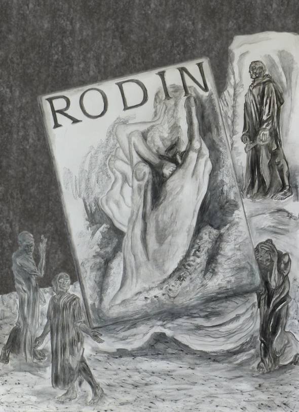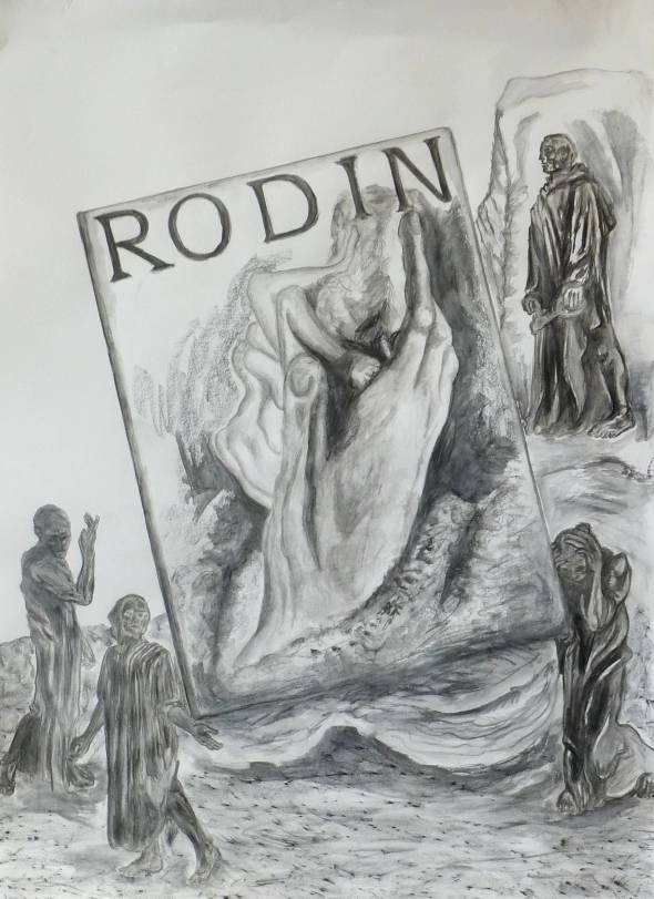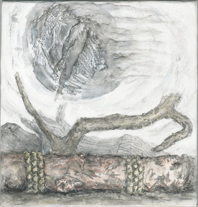 This is another more complete piece that started as a monoprint, now titled “Encounter”. I had no idea where this piece was going until I added one of the dog figures using a stencil made from contact paper… the piece took off from there, and I like it now. Not sure if these are feral or fully wild “dogs” 🙂