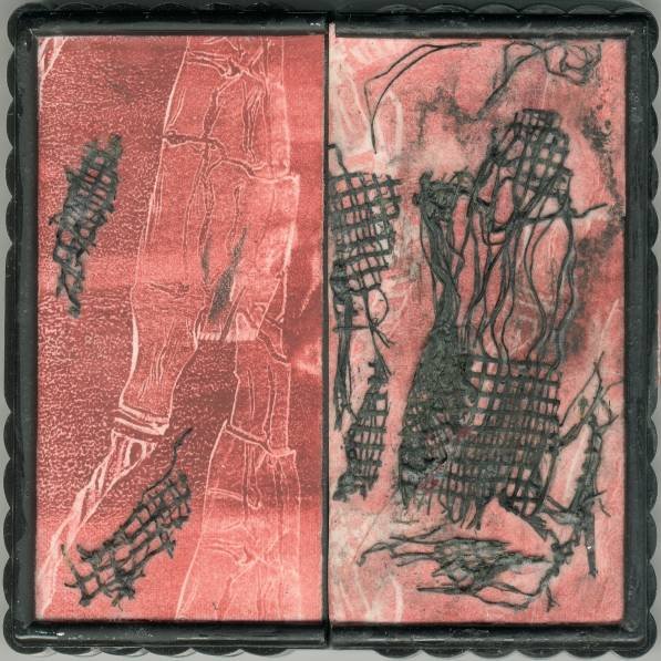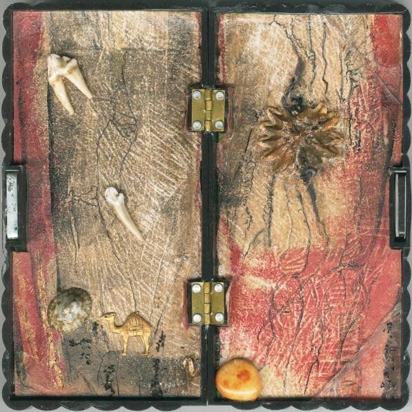 I replaced the chequered chess board outside pieces with sections of an enhanced monoprint, also used to line the inside of my box.Then I added the “artifacts” on the inside, which include found animal teeth, a shell, a stone, and an intricate seed pod. So now here is another of my personal “spirit boxes”: something of a small shrine. This one is small & portable enough to pack to take traveling :-). The magnetic latch & hard plastic will allow me to store a few small items safely inside: maybe a pair of earings?