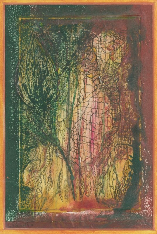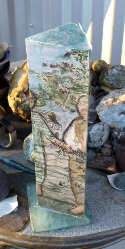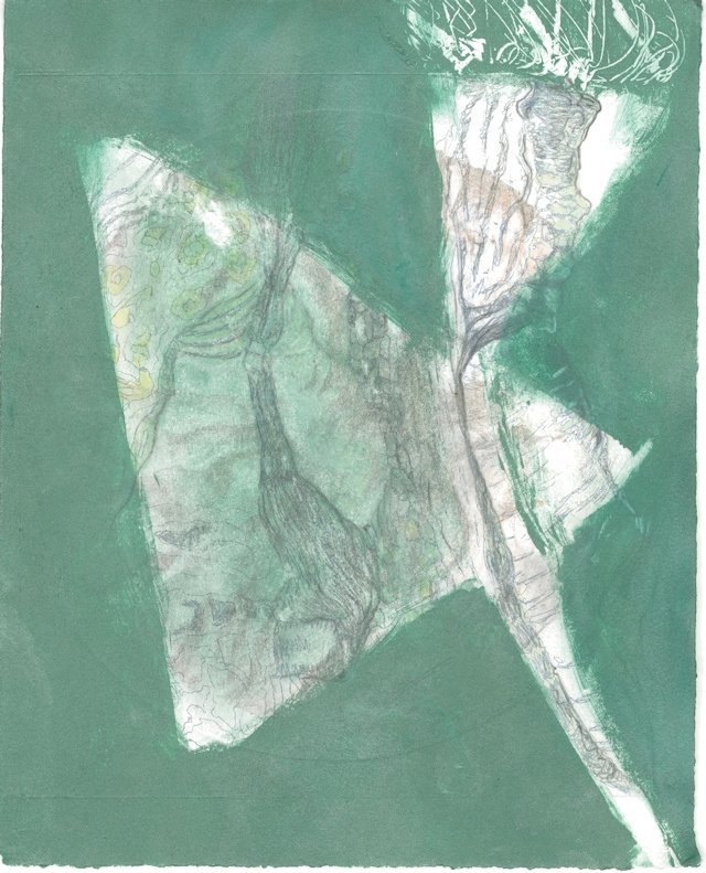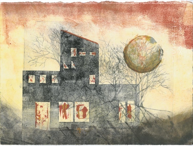 The finished work: after playing with some digital collages (prototypes for the design), I used my water soluble graphite stick & disk to paint in the dark ground and the tree & sky background.