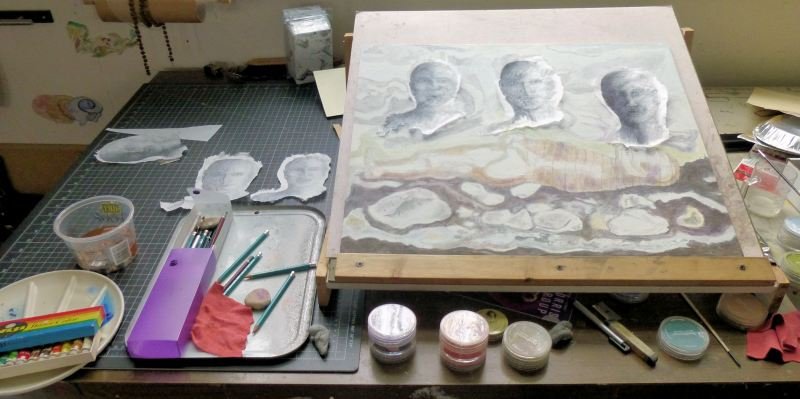 Sometimes an artwork comes together quickly, in an intensely satisfying rush! But more often my work evolves slowly, and I may finish an incomplete piece months or even years later, adding newer elements with drawing, paint and collage, or just by finding the right way to present an older piece. This approach is satisfying in a different, steadier way!