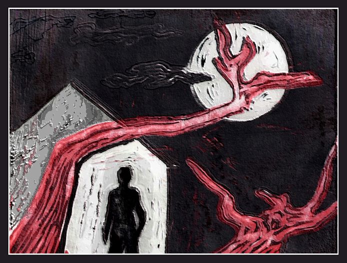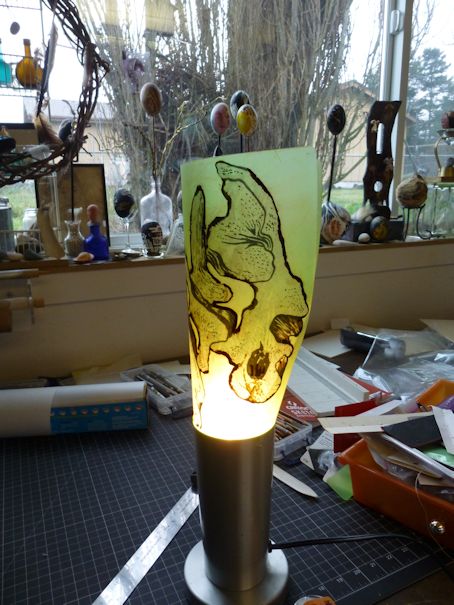 Using recent print work to make a new lampshade, and modifying a much older most unsatisfactory print is filling my time before a undertake a new larger project. The lampshade is getting more layers of bone, and the green will be toned down quite a bit (but still glow). The red & black print has been distressed with water, touched up with pen & pastel, then scanned and digitally modified.