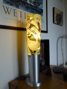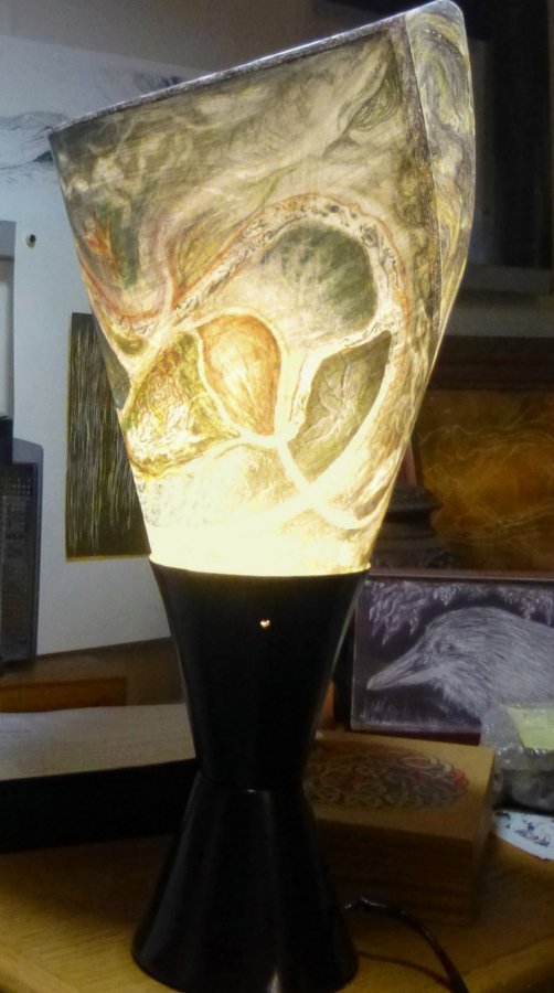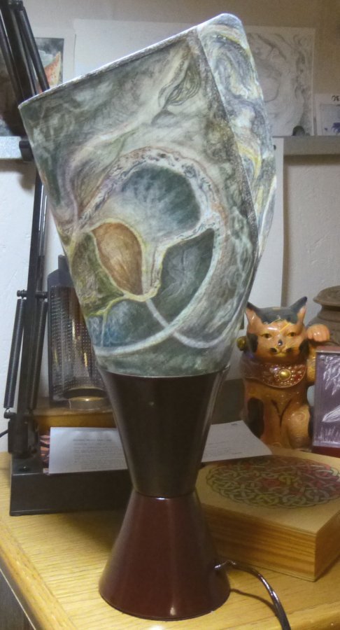 I applied my art to clear flexible cutting mats to make the shades. The lamp bases came from thrift stores, and are probably bases from broken lava lamps.