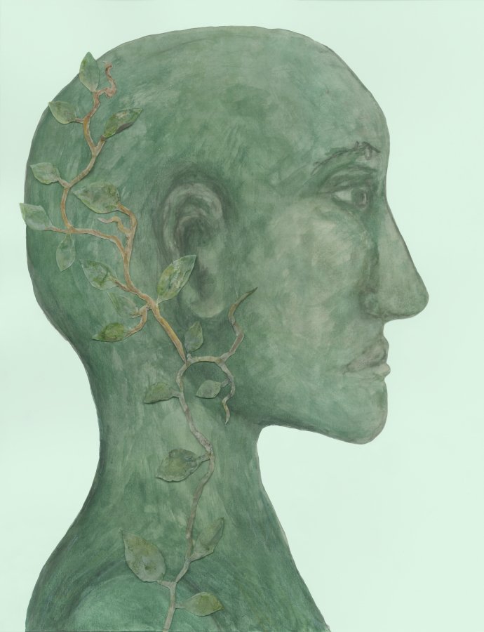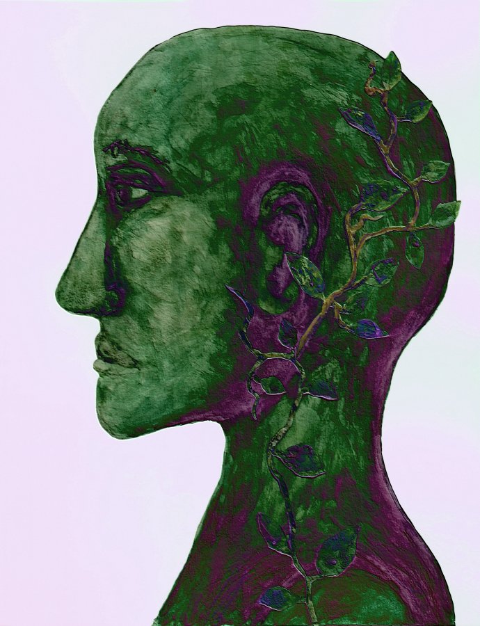 This gentle Green Man has appeared previously in a storm of leaves, but now it is Spring, and the pea vines are growing fast! And I am enjoying all of these gentle green man variations with leaves and vines, so I continue to work and elaborate on this theme.