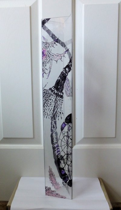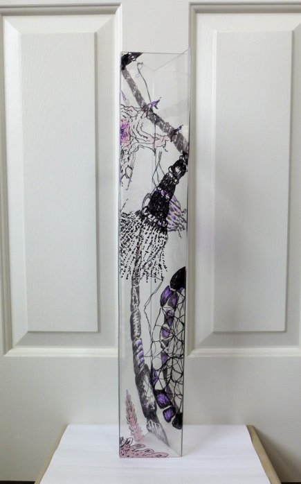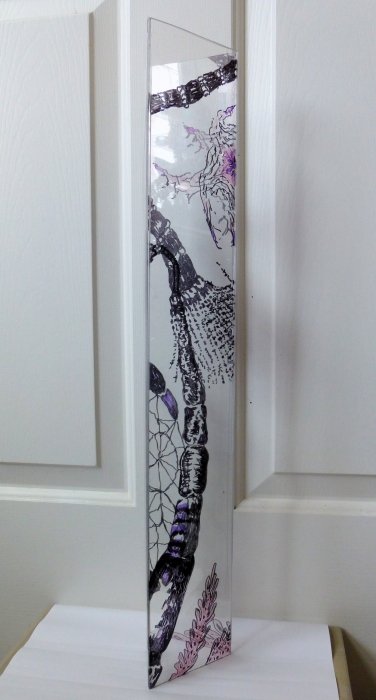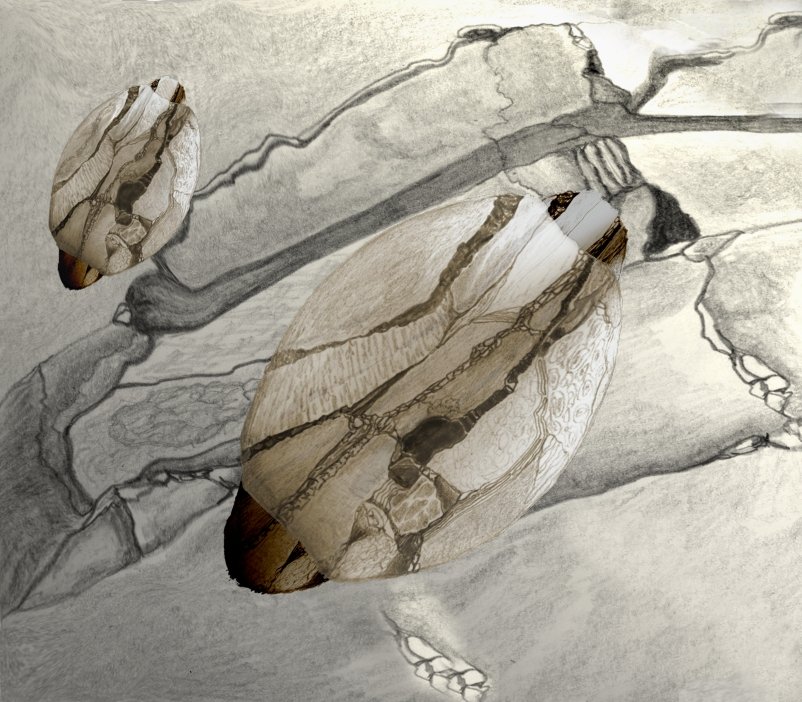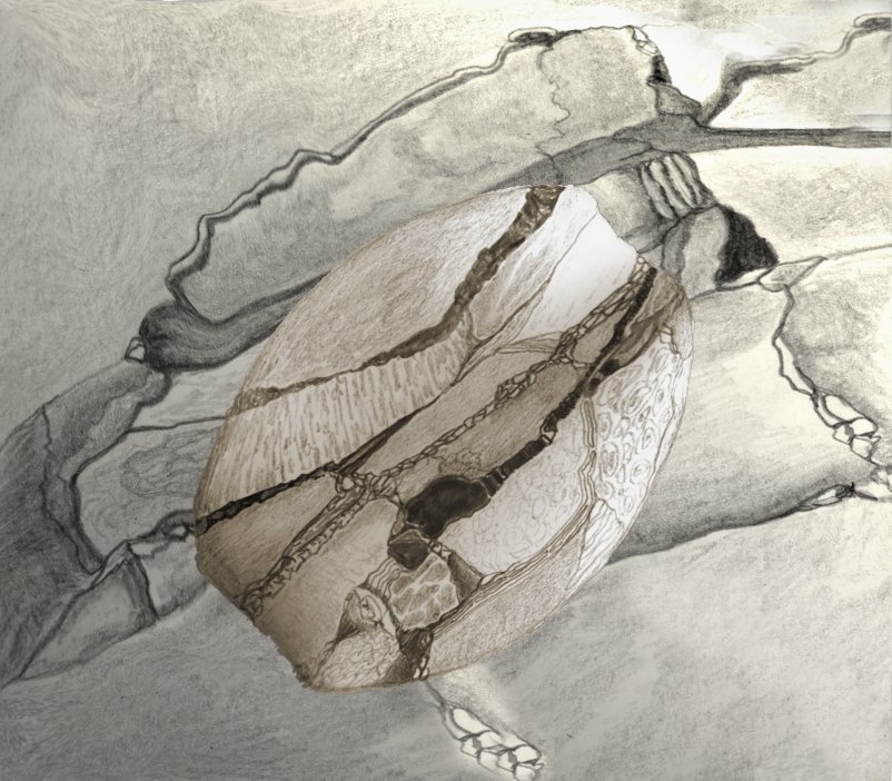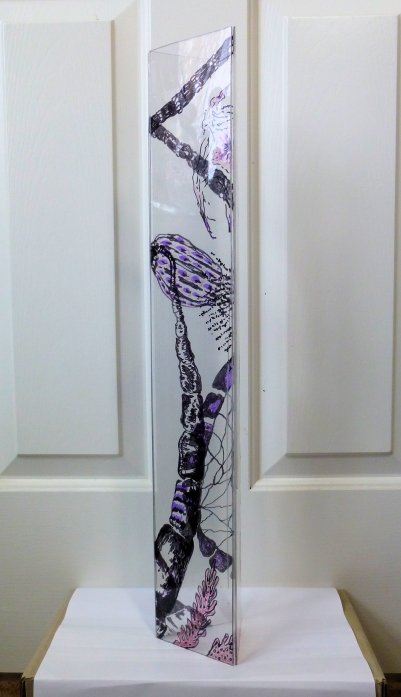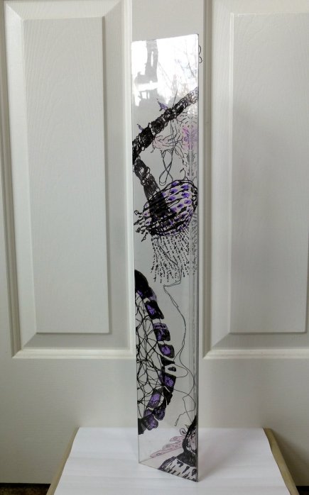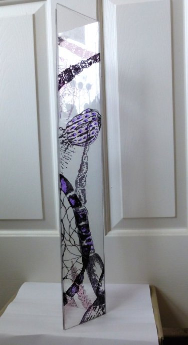 Using recent print work to make a new lampshade, and modifying a much older most unsatisfactory print is filling my time before a undertake a new larger project. The lampshade is getting more layers of bone, and the green will be toned down quite a bit (but still glow). The red & black print has been distressed with water, touched up with pen & pastel, then scanned and digitally modified.