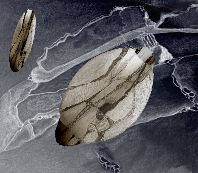 I am still enjoying this piece, and have added more as shown below: more color fill makes the overlaid bones into a more substantial “body”, and the red-green contrast wakes it up a bit. The second scan is duller than the reality, which has two shades of green.