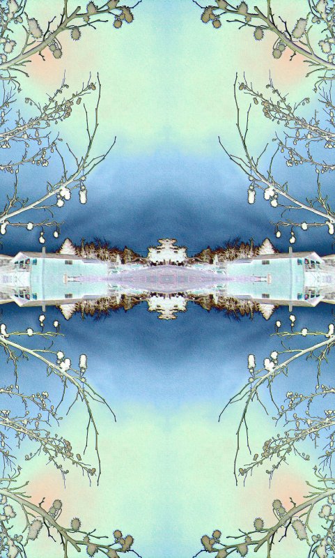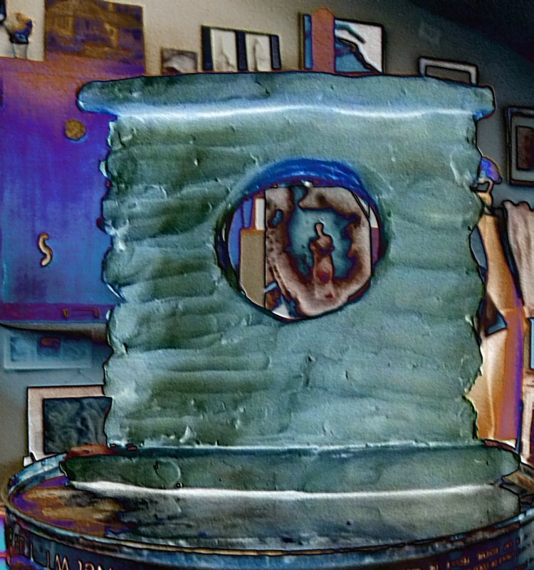 My Moon Snail in clear resin (with various embedded items) has been mounted into a very lightly tinted circle with a hint of green gold and more embedded items. It may be destined to be a light fixture, a lit sculpture, or to hang in a window: to be determined! It will get another bit of clear resin when the next shipment arrives. In the meantime, I have played with a photo or three, adding that old digital pixel dust!