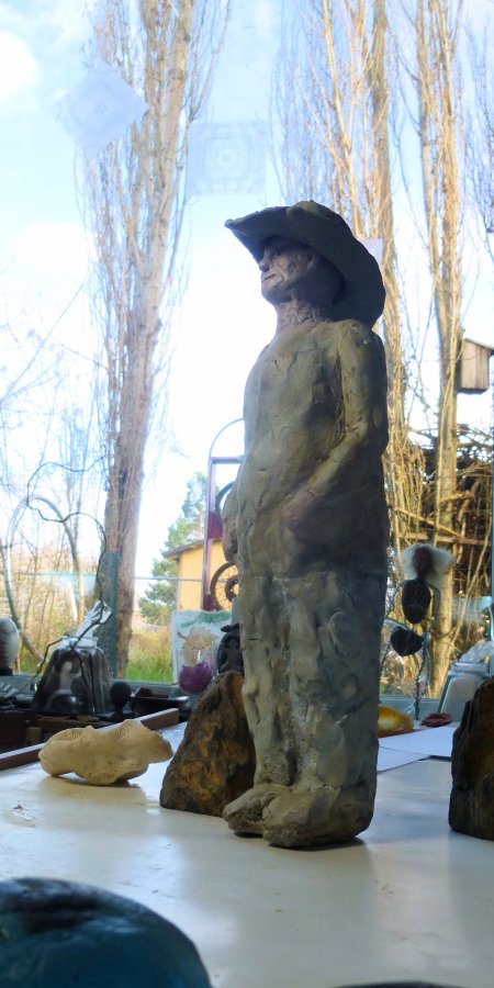 This sculpture thing is a lot of work: original, mold making (torture!) then casting (not trivial!). Then finish work, detailing, painting (if desired) and mounting. Notice the listener above is not just listening, but listing a bit… I thought I had him firmly secured and set just right … but he was intended to be an upright character, not slightly off-kilter as if he had one to many at happy hour!!! Oh well, next time!