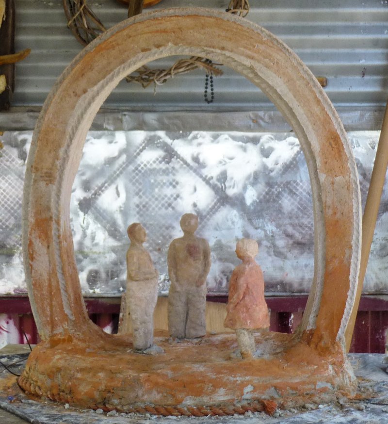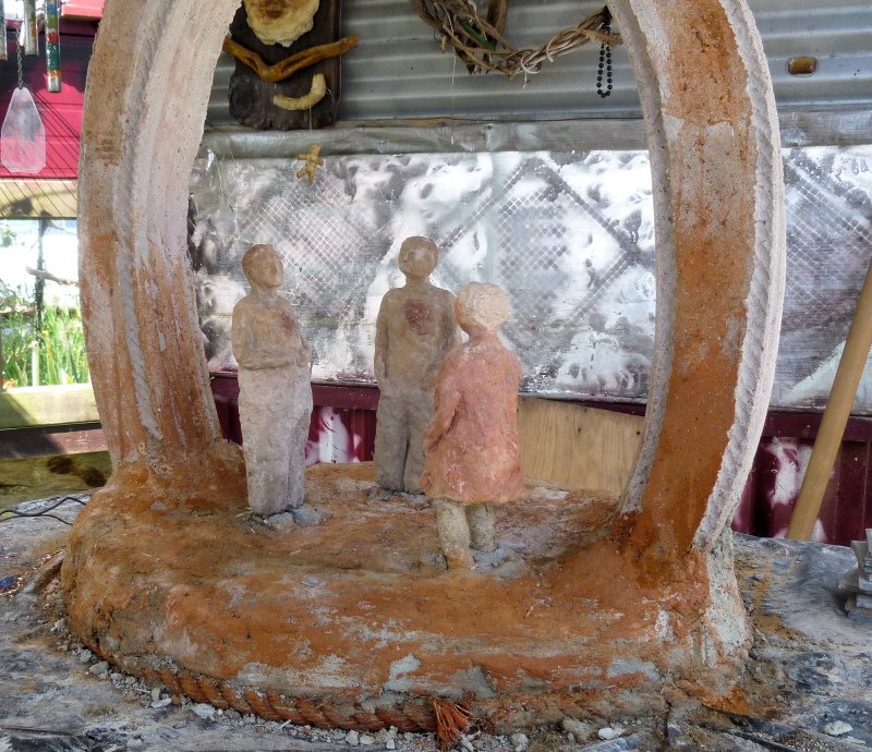 Cement work can be slow going: creating forms or armature, then actual cement, then dry times, etc. The arch will be part of an installation with my small cast concrete Conversation figures. The large figure is intended for a large scale Conversation group, if the result is good enough and if I have the energy to make a full set!