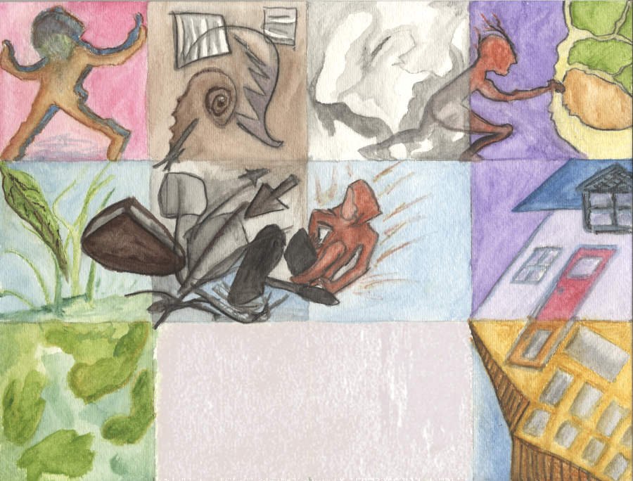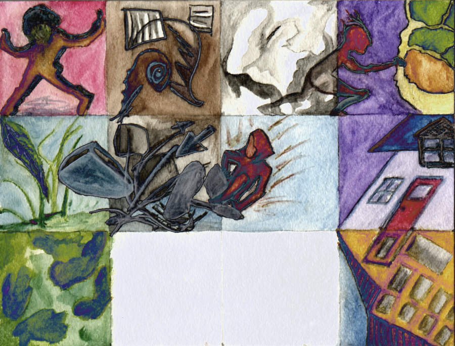 This is a 9?x12? page divided into 12 squares, each representing difficult achievements in my life! The inspiration is the Twelve Labors of Hercules, the media are water soluble graphite, watercolor pencil, & watercolor paint on paper, draft 1 is on the left, draft 2 in the center, with the digital version of draft #1 at right.