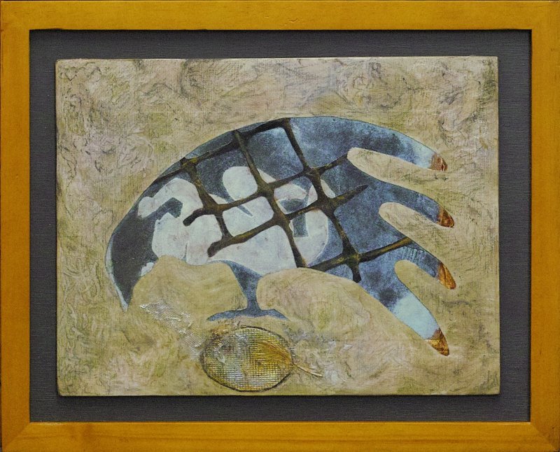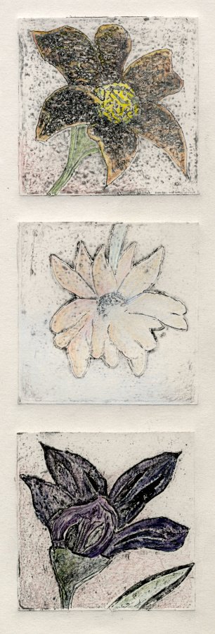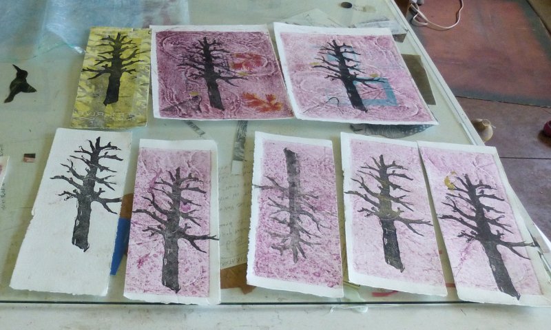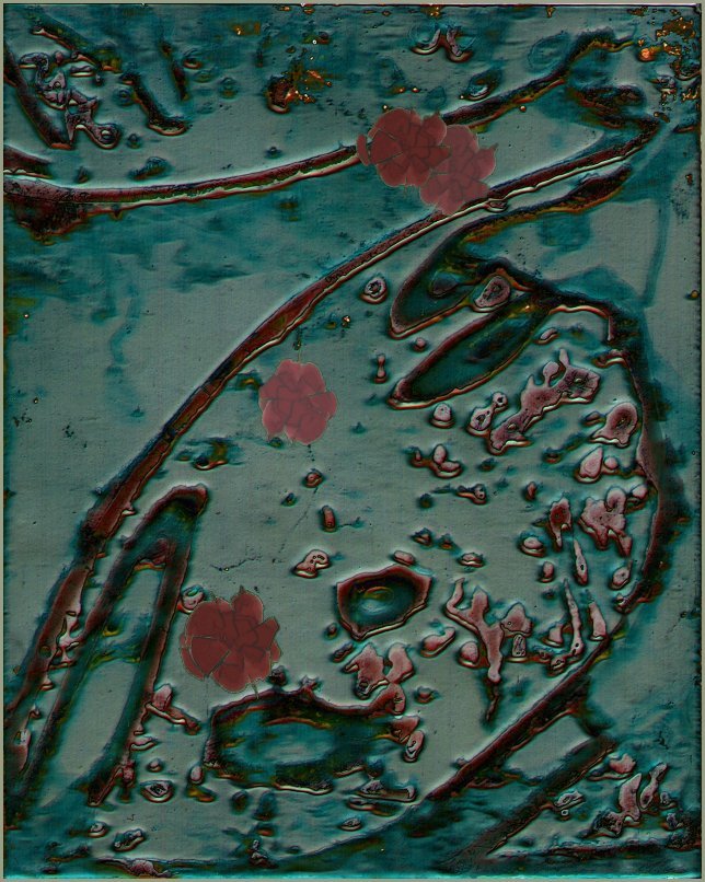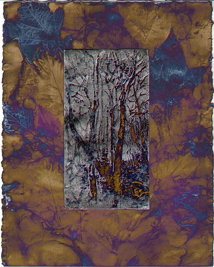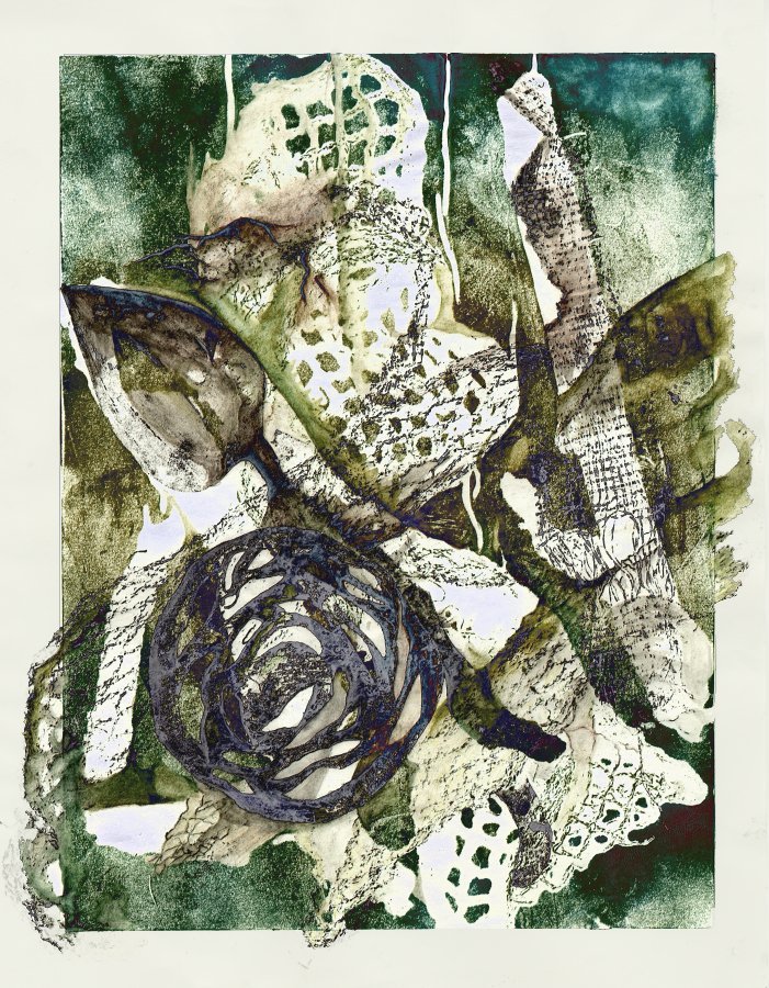 I modified the oil based ink print, using watercolors to create soft curtains of transparent color, before working on the scanned digital image.