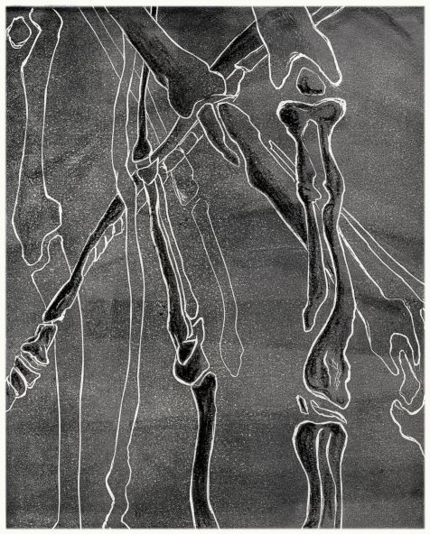 I am still enjoying this piece, and have added more as shown below: more color fill makes the overlaid bones into a more substantial “body”, and the red-green contrast wakes it up a bit. The second scan is duller than the reality, which has two shades of green.