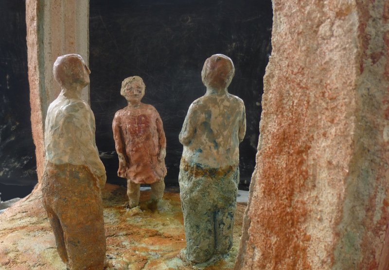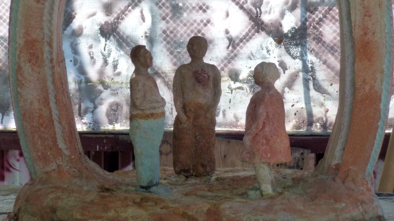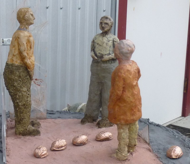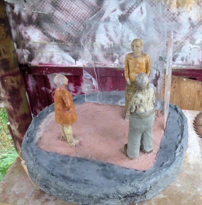 First full figure cast. The mold for this was made over a pieced together figure: a head & torso in plaster from a previous “thick figure” cast, then carved/modified & joined to clay legs. I used brush on latex, and a 4 part “Sculptamold” mother mold (took ages to dry, not a good choice of material). Now I have my first complete concrete figure with cast legs. Previous figures had metal bolt legs that I then wrapped with cement fabric, etc.