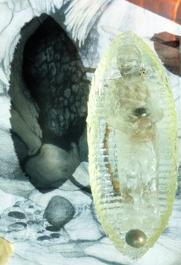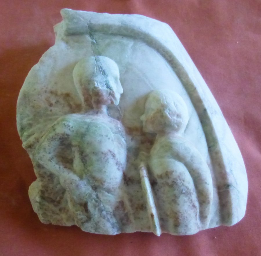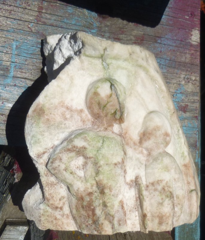 My trick is to use epoxy putty, from Aves, to build out the cutout hole around the back of the carving in order to fit. Then I will add more epoxy clay to the back of the wood and the stone carving, to join them together and to reinforce the carving across the natural faults and fractures of the alabaster.