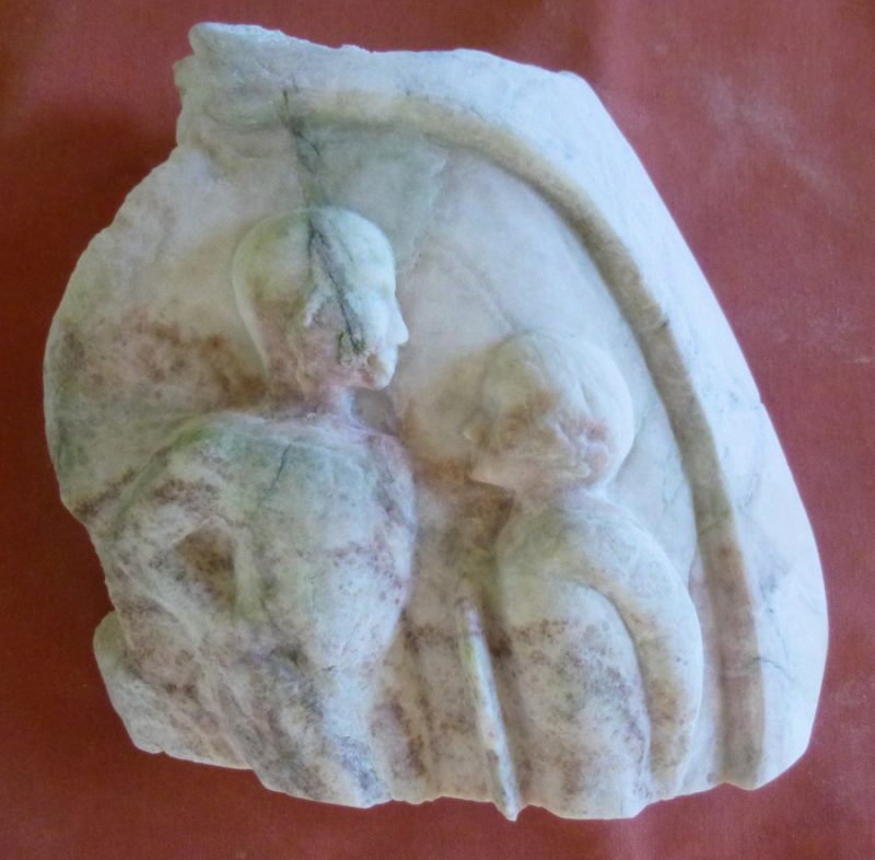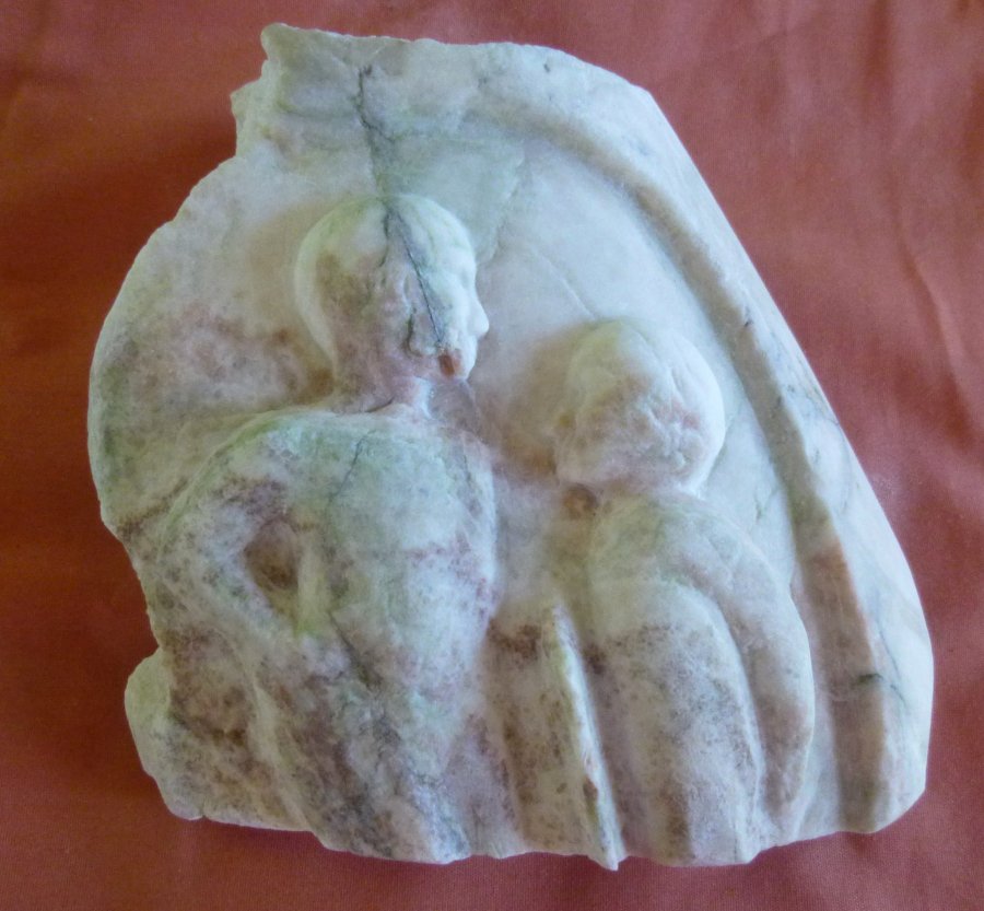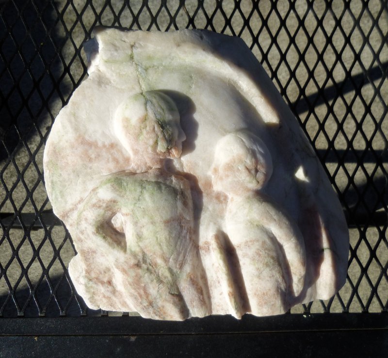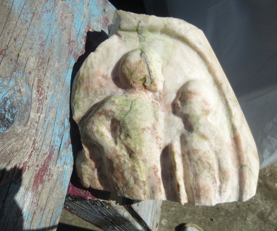 I was struggling with the idea of partially embedding the carved stone in liquid epoxy resin to create a reinforcing base. But I could not come up with a satisfactory implementation plan. Then the light dawned: I decided to use epoxy putty/clay rather than liquid resin, leaving the face of the sculpture free.
