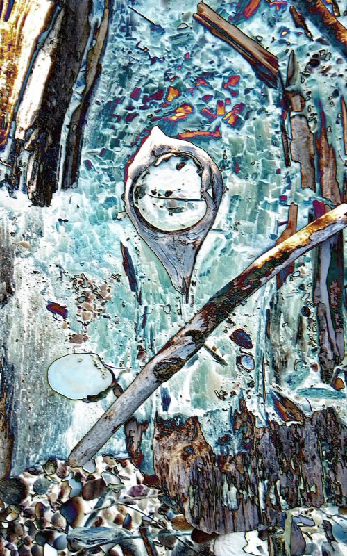 My Moon Snail in clear resin (with various embedded items) has been mounted into a very lightly tinted circle with a hint of green gold and more embedded items. It may be destined to be a light fixture, a lit sculpture, or to hang in a window: to be determined! It will get another bit of clear resin when the next shipment arrives. In the meantime, I have played with a photo or three, adding that old digital pixel dust!