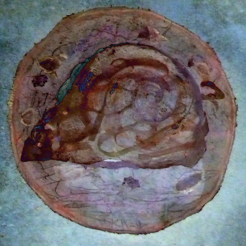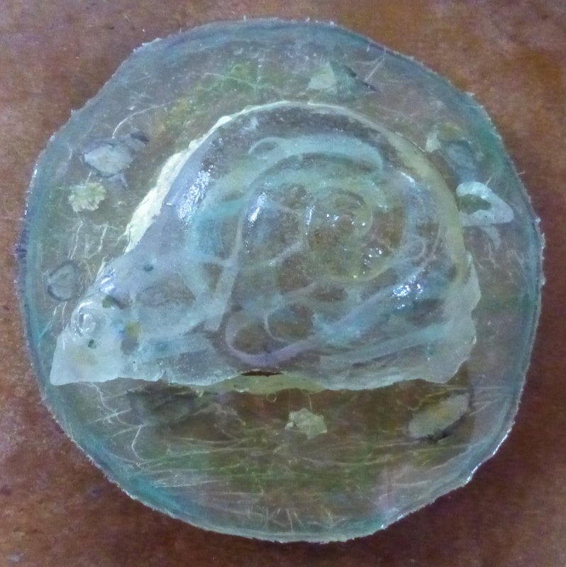 I am plugging away on resin casts (both this “Ruins” and my Moon Snail. Somehow they just look naked when they emerge from the mold. At first the new cast delights me: if the casting is a success I have a new “baby”! But after a few days I find myself a bit less satisfied…