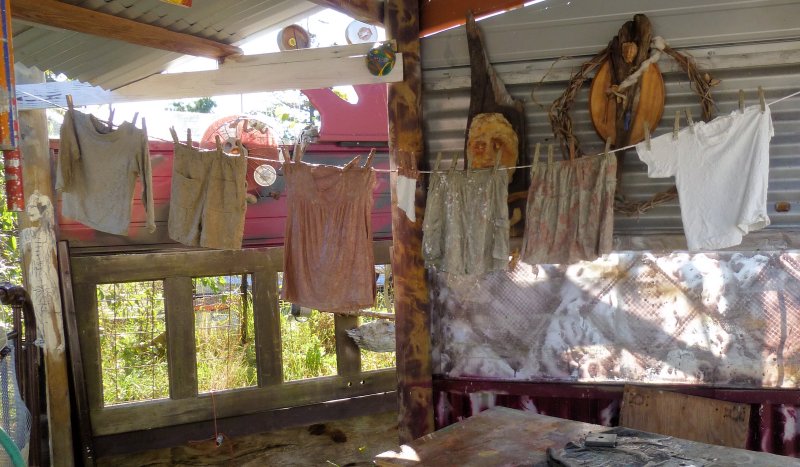Clothesline P.T. Artist Sandra Stowell Posted on September 10, 2016 by ptartistSeptember 11, 2016 Now in my outdoor work space: the Clothesline project! Need to get this all done before I put away the cement for the winter! I have one more item of clothing curing, but I would like to dip some child size socks and gloves as well.