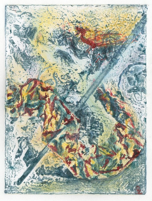 I have been losing my frustration (about not getting into juried shows) by work: always the best solution. So here are updates, maybe completions, of several items in work: first is an aquarelle graphite “Excavation”, the second an older pencil drawing on vellum. The three colored pieces are recent collagraph prints that were dull monotone until the addition of pan pastel,colored pencil, & pen.