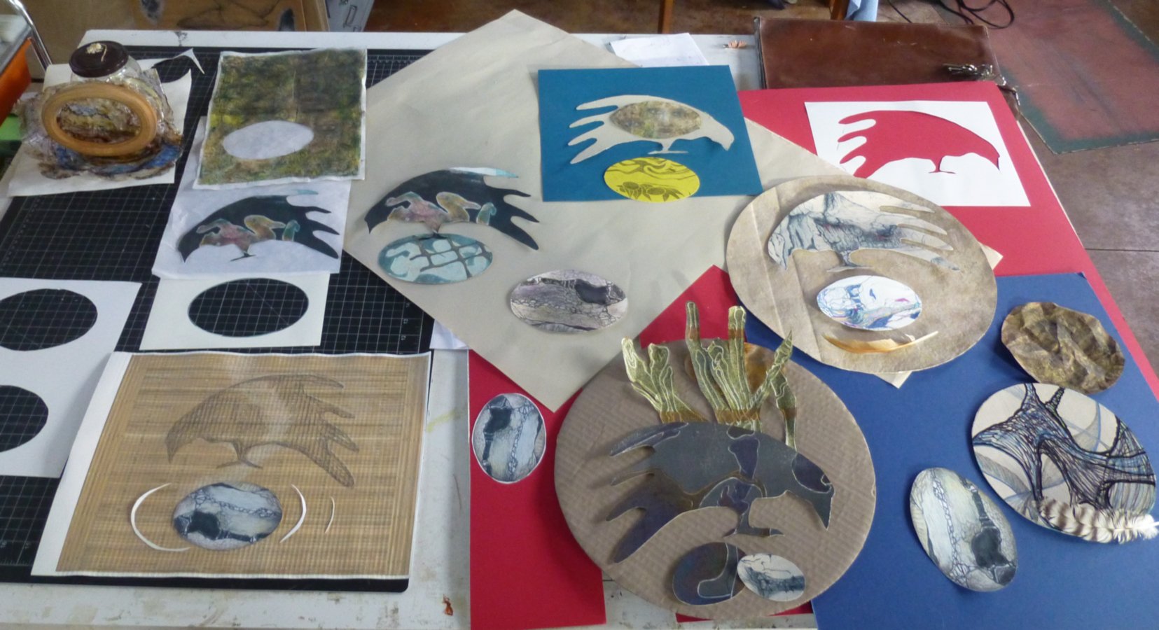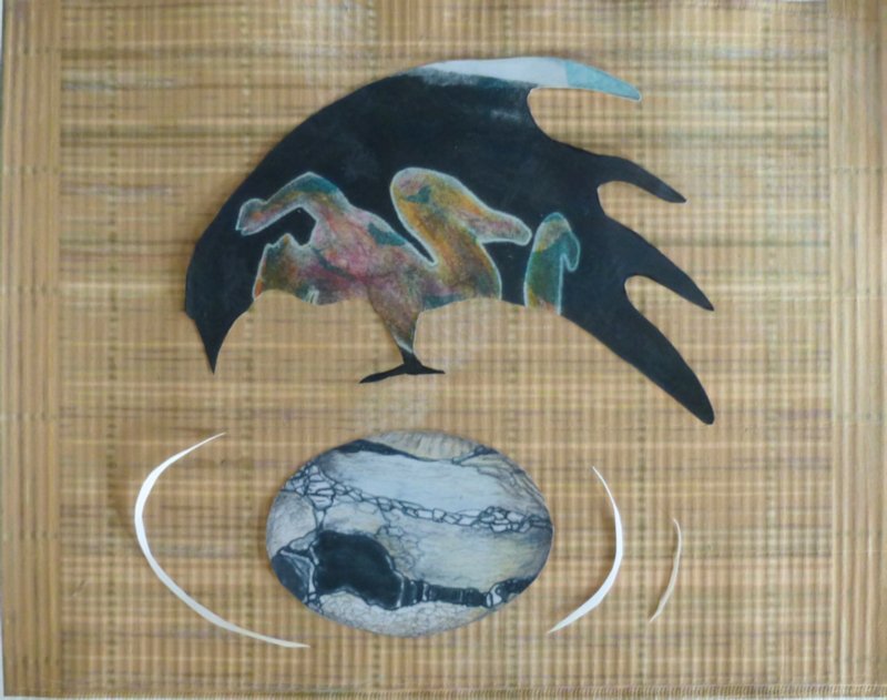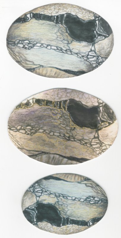 You can see here the progress of different crow / dancer / egg world pieces as they evolved. More still in progress, of course! Some of these pieces may never be finished works… but the crow will be in several, I am sure. Meanwhile I struggle to show these pieces as images: scans do not show much dimension, & lose metalics, gloss, etc. but photos are so lighting dependent so often have glare, lighting, and color problems!