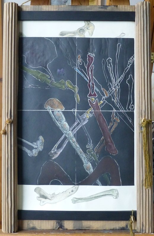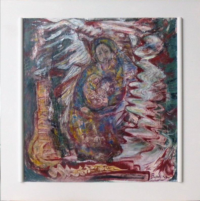 Four linocut plates first printed in 2013 are the basis for this bones scroll. It may be finished now, but I am never quite sure … The print now has additional graphite paintings (of bones) top & bottom, and is presented in a corrugated & tasseled scroll “casing”. My painting “The Burden” has also had quite a bit more work, including added color and layers of gel medium, is now mounted onto 24″x24″ painted board. It can be hung as is, or considered ready for framing.
