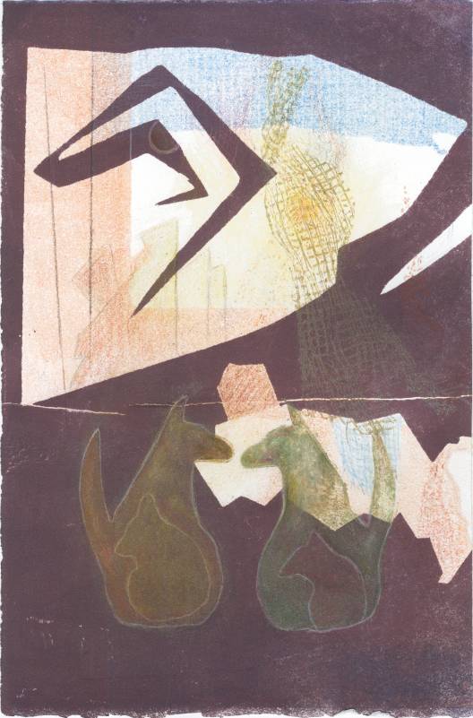 This is another more complete piece that started as a monoprint, now titled “Encounter”. I had no idea where this piece was going until I added one of the dog figures using a stencil made from contact paper… the piece took off from there, and I like it now. Not sure if these are feral or fully wild “dogs” 🙂