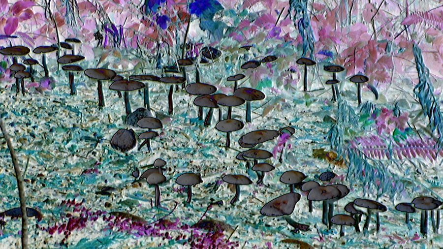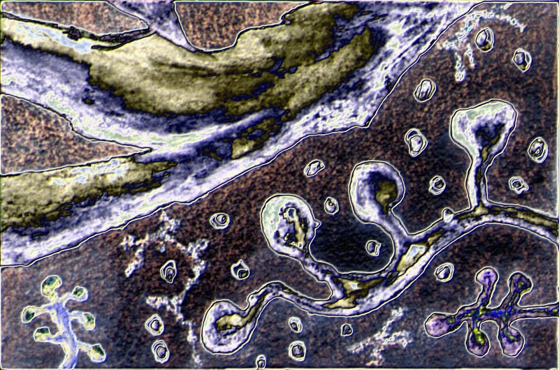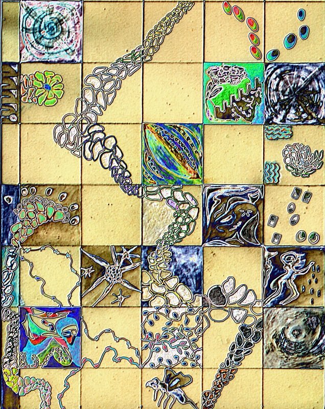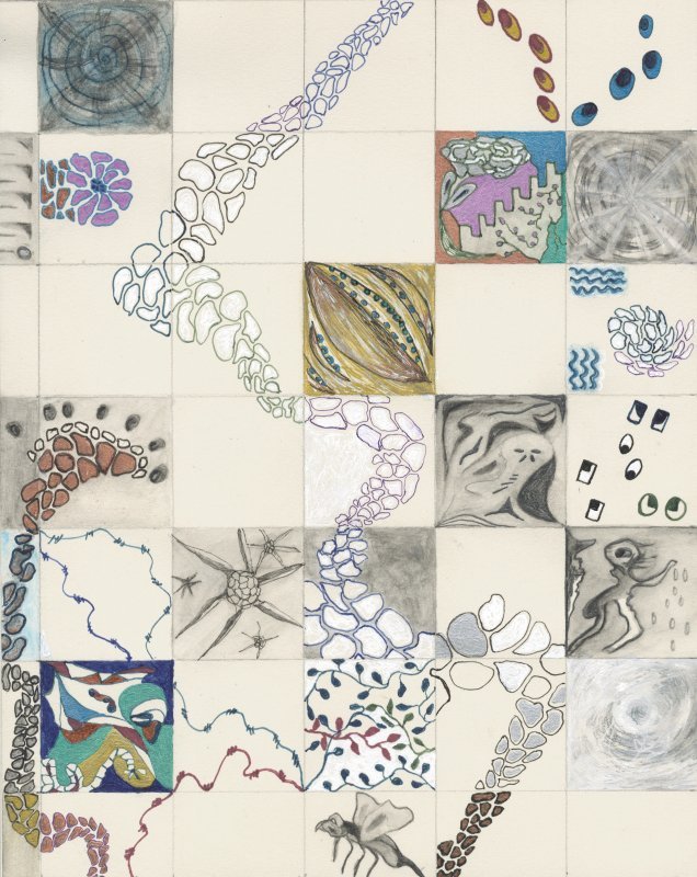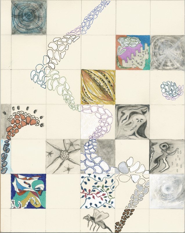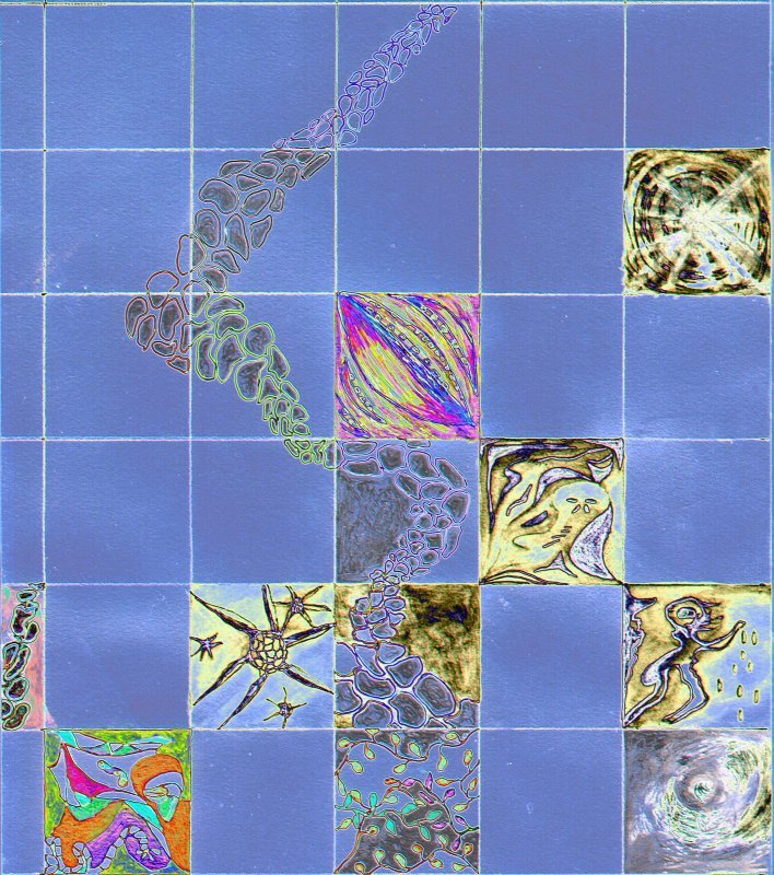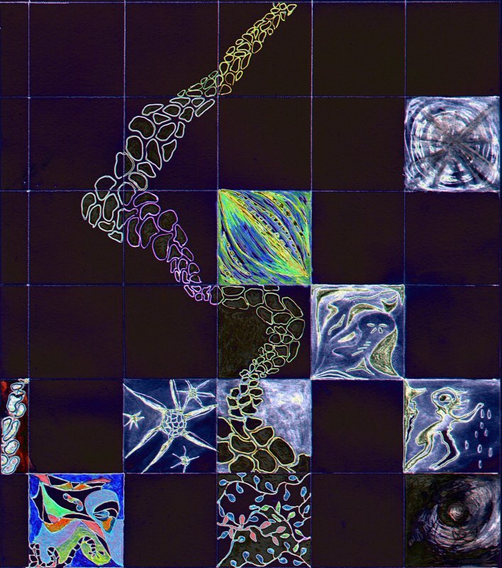 They stand in front of a two dimensional galaxy of shooting stars, or perhaps it is a greenboard extensively marked up with complex curves & intersecting lines. The platform could be a station for some unspecified transportation system, or it could be a strip of beach. It is dotted with odd dark elongate half dome “boulders” that on close inspection appear to be weather worn: multi-colored, with shallow fissures, and lumps. The surface of the platform has a hard to see design: it takes a very close look to find the two figures stand on a row of dark strange faces…