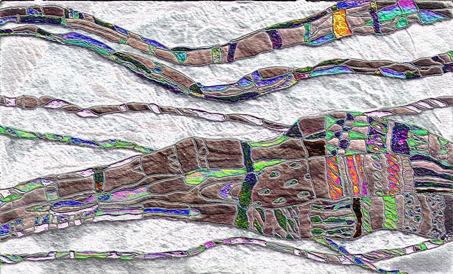 Item 3, tertiary, mixed media based on a lino cut print: