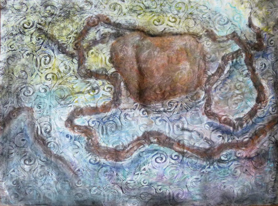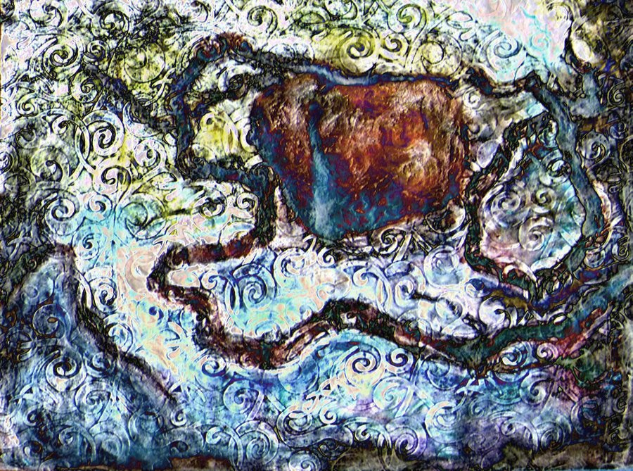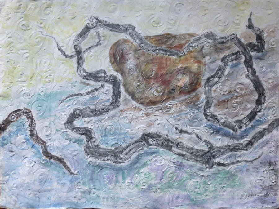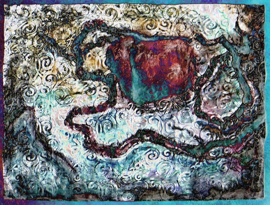 I started with a large sheet of heavily embossed paper, with a swooping but formal machine made swirling pattern. I liked it, but … it was disturbingly regular & repetitive. So of course I wanted to mess with that! Above, on the top row, you see draft #1 at left, done with watercolors, then draft #2 with the addition of a few layers of soft pastels and various clear artists’ mediums.