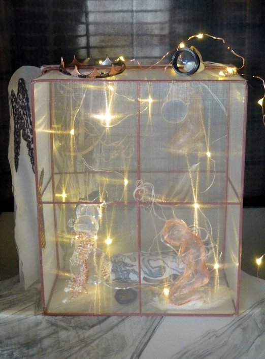 This is a finely woven “silk” box given me by a friend for creative use. I have found a place for some resin pieces made several years ago & never incorporated into a finished work. I like having multiple surfaces: layers! I can attach things inside on two surfaces, and outside on both surfaces: there is no front & back (but there are sides…). And actually I can put this together in two ways: lid on, or lid behind.