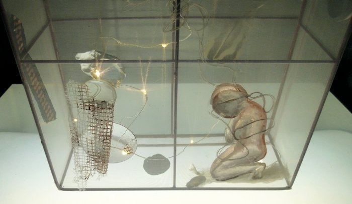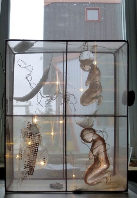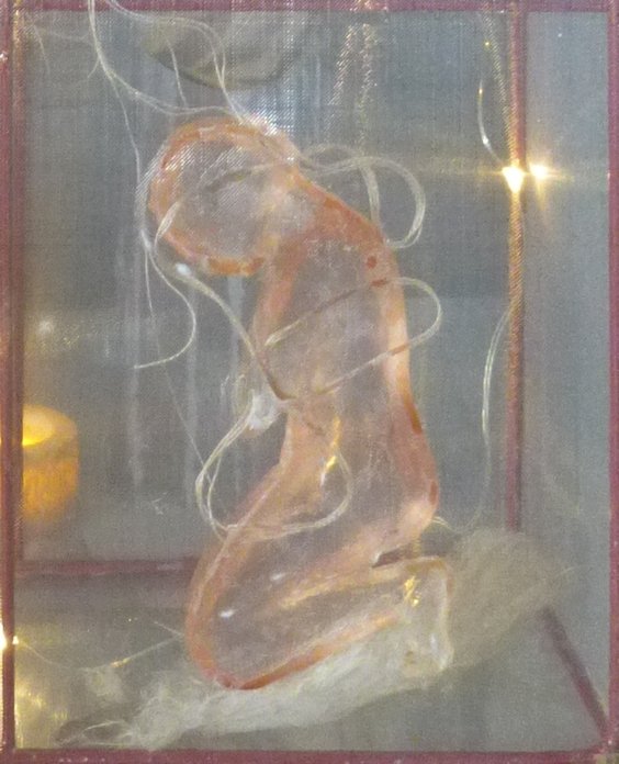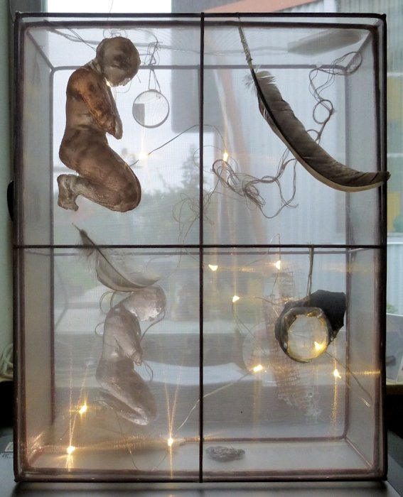 Not sure what this piece is about. The kneeling figure was cast in resing from a figure I carved in soap, while spending a winter in Mexico, surrounded by Catholic churches. It is about reverence, and perhaps there is some allusion to death/ascendence? And flight, and a “lightness of being” or perhaps “not being” (death).The lenses may be about trying to see more/further.
