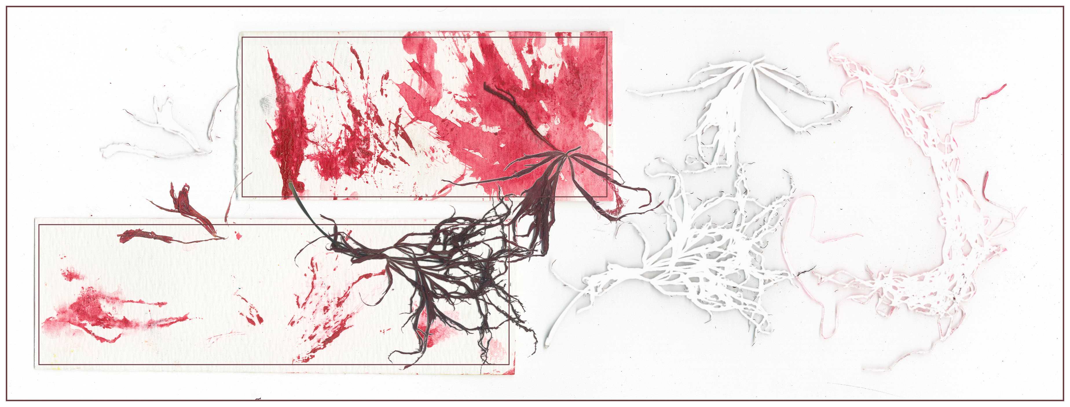 Above is a digitally modified layered collage that started as a carefully arranged scan of red maple leaves, a scrap of red mesh, and two strips cut from a blotter. Just some fun…