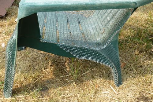 The cement project is a concrete chair: I started with a broken resin “adirondack” chair that Michael kindly reinforced with a little rebar, wire, and epoxy. Then I got to work with expanded metal lath (aka blood mesh). Today, I used a stiffish mortar mix to putty the chair legs, and up along parts of the body to hide the plastic and to make the legs stronger for the increased weight.The chair is under wraps for a few days to allow the mortar to cure before I move it around for the next steps. The plan is to use fabric soaked in high cement mortar stretched out on top of the chair seat & back, laying it over the expanded metal. I may need to put another smoother surface over this, and perhaps I will need to cut the fabric in two pieces to better avoid wrinkles! I will be experimenting a bit more before this step!