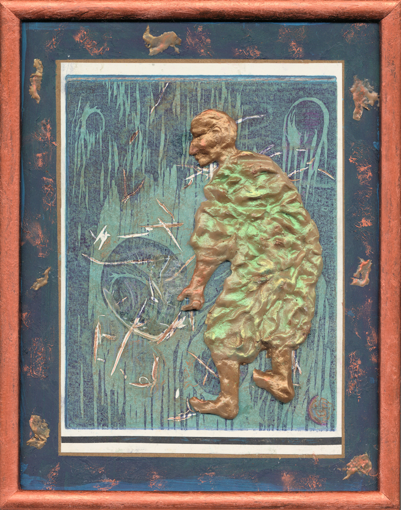 I have also experimented with a new material in an old cast of my draped field worker figure. And I found a home for him, lifting a fallen planet! This background is an old linoleum print that did not have enough value as a stand alone work.