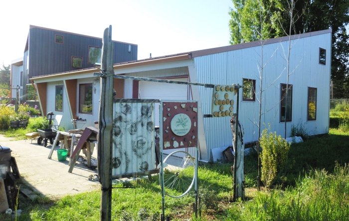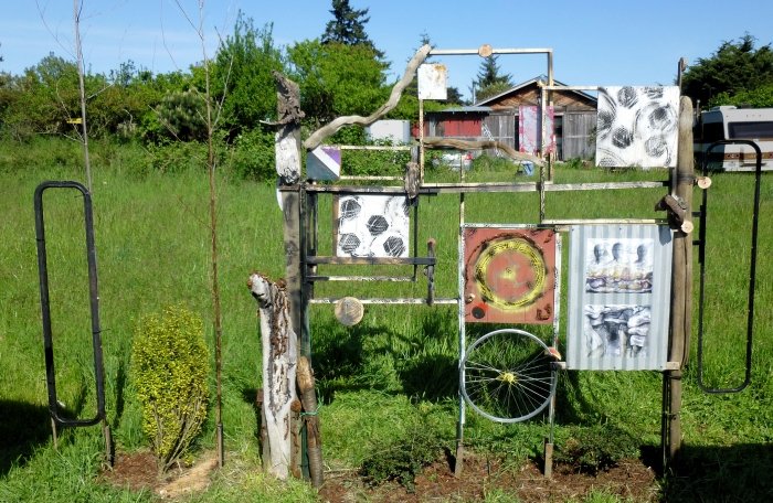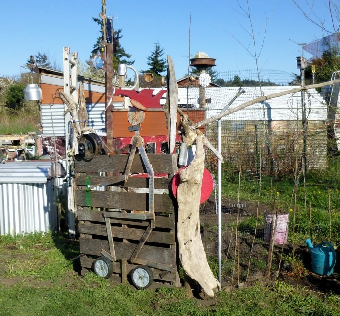 My seemingly casual assemblies of found objects and scrap often do serve useful purposes; they keep out deer, screen & anchorĀ my trash cans, etc. But the work is as much about building my aesthetic, stimulating my creativity, and keeping me happily engrossed in making art!