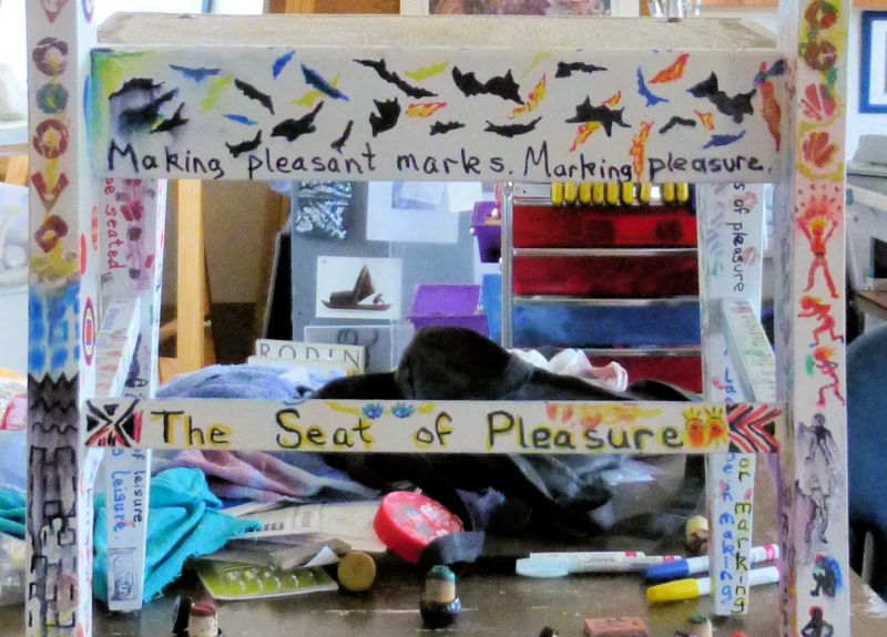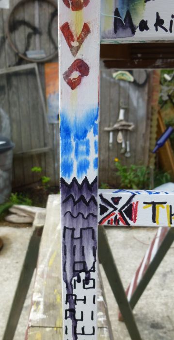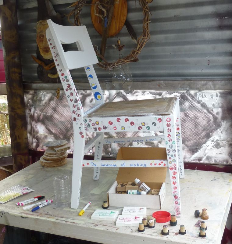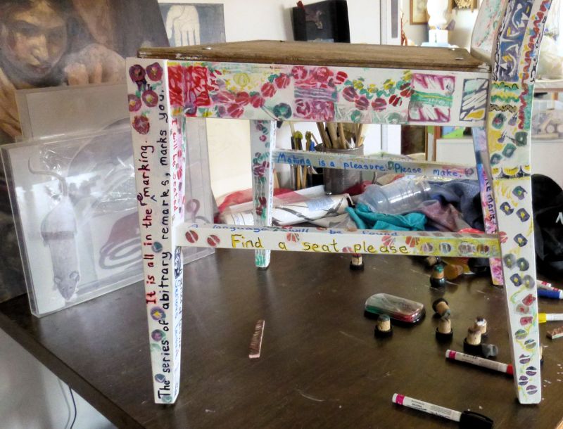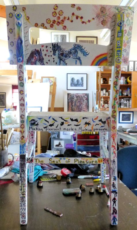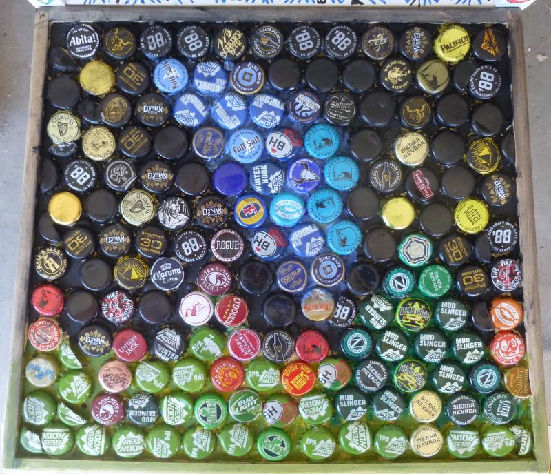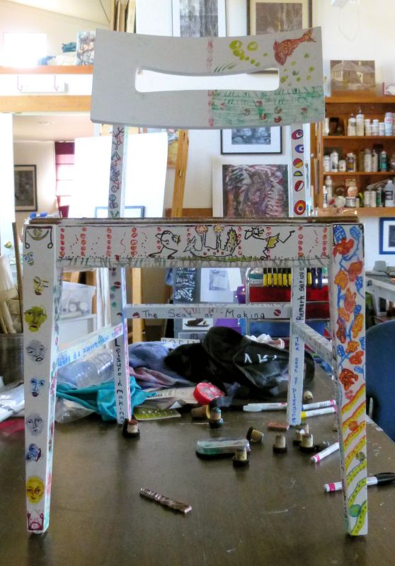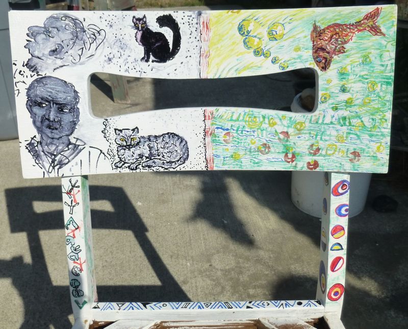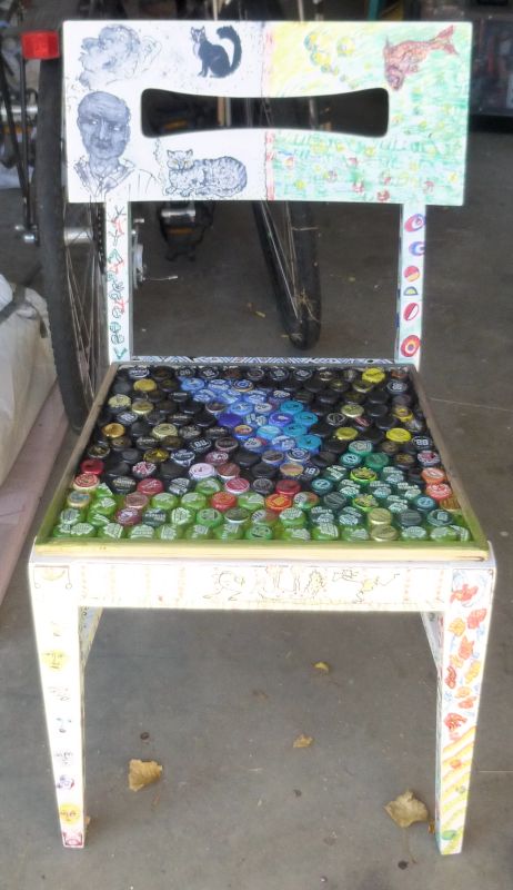 One of two sturdy wooden chairs in a FREE pile, acquired at least a year ago. Now almost transformed from ugly old finish & stained orange seat cover, to weird art project! MJ contributed the beer caps from his collection… and a few fellow artist contributed sections of the paint work!